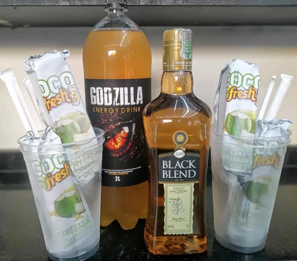 O kit acompanha 1 Whisky Black Blend 1 litro, 1 Energético Godzilla 2 litros, 4 gelos, 4 copos e 4 canudos. PARA 4 PESSOAS.