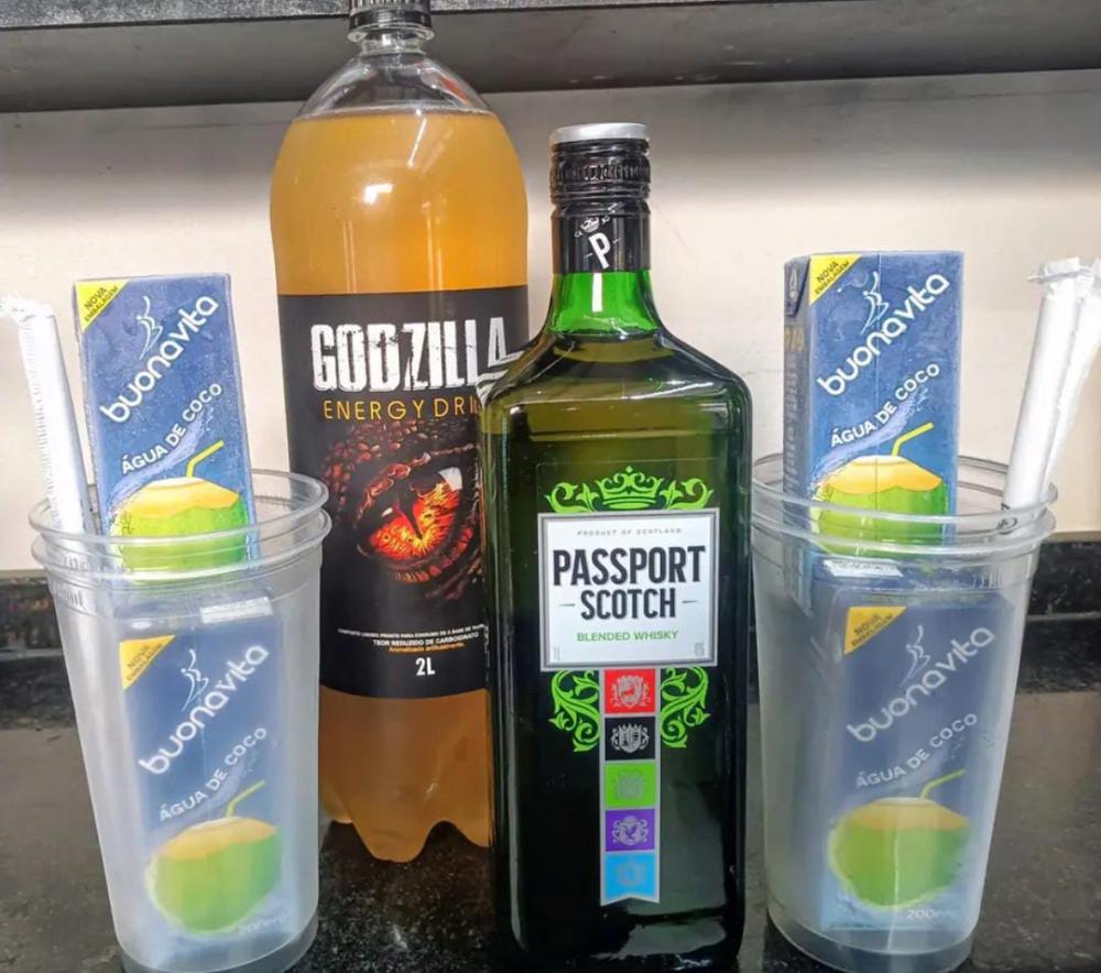 1 Whisky Passport de 1 Litro, 1 energético godzilla de 2l, 4 gelos Coco de caixinha, 4 copos e 4 canudos. PARA 4 PESSOAS.