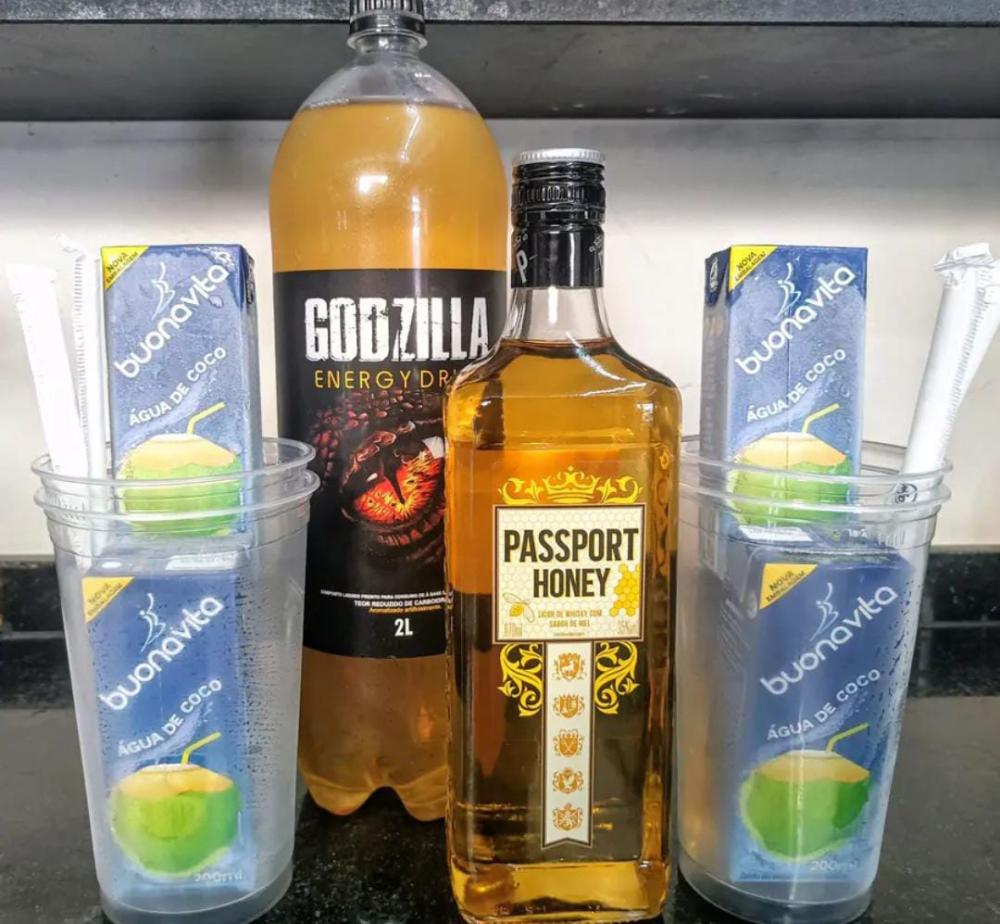 1 Whisky Passport de 1 Litro, 1 energético Godzilla de 2 Litros, 4 gelos Coco de caixinha, 4 copos e 4 canudos. PARA 4 PESSOAS.
