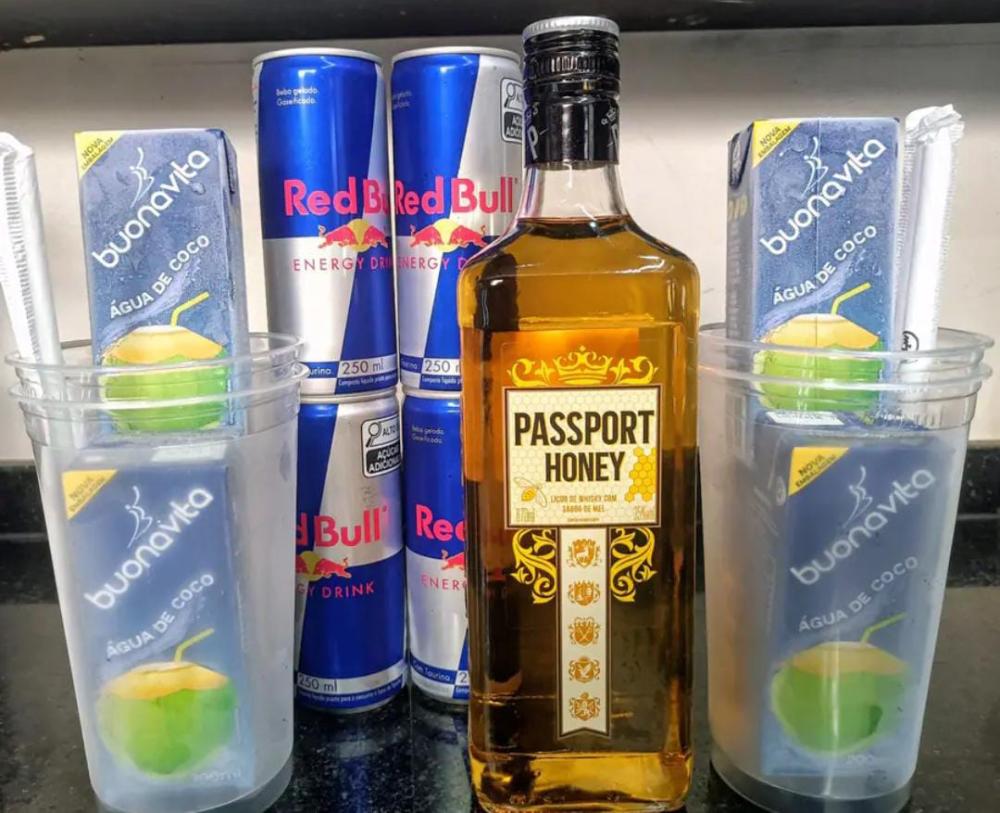 1 Whisky Passport de 1 Litro, 4 energéticos Red Bull de 250ml, 4 gelos Coco de caixinha, 4 copos e 4 canudos. PARA 4 PESSOAS.