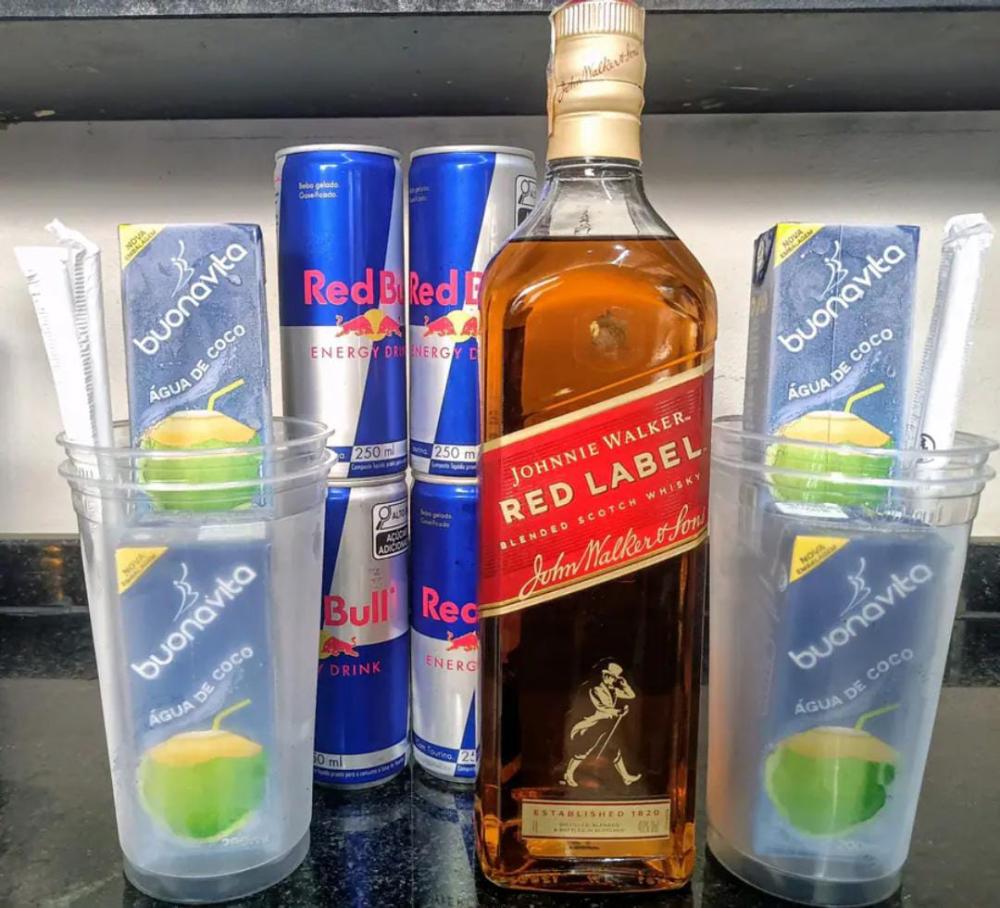 1 Whisky Red Label de 1 Litro, 4 Energéticos Red Bull de 250ml, 4 gelos Coco de caixinha, 4 copos e 4 canudos.