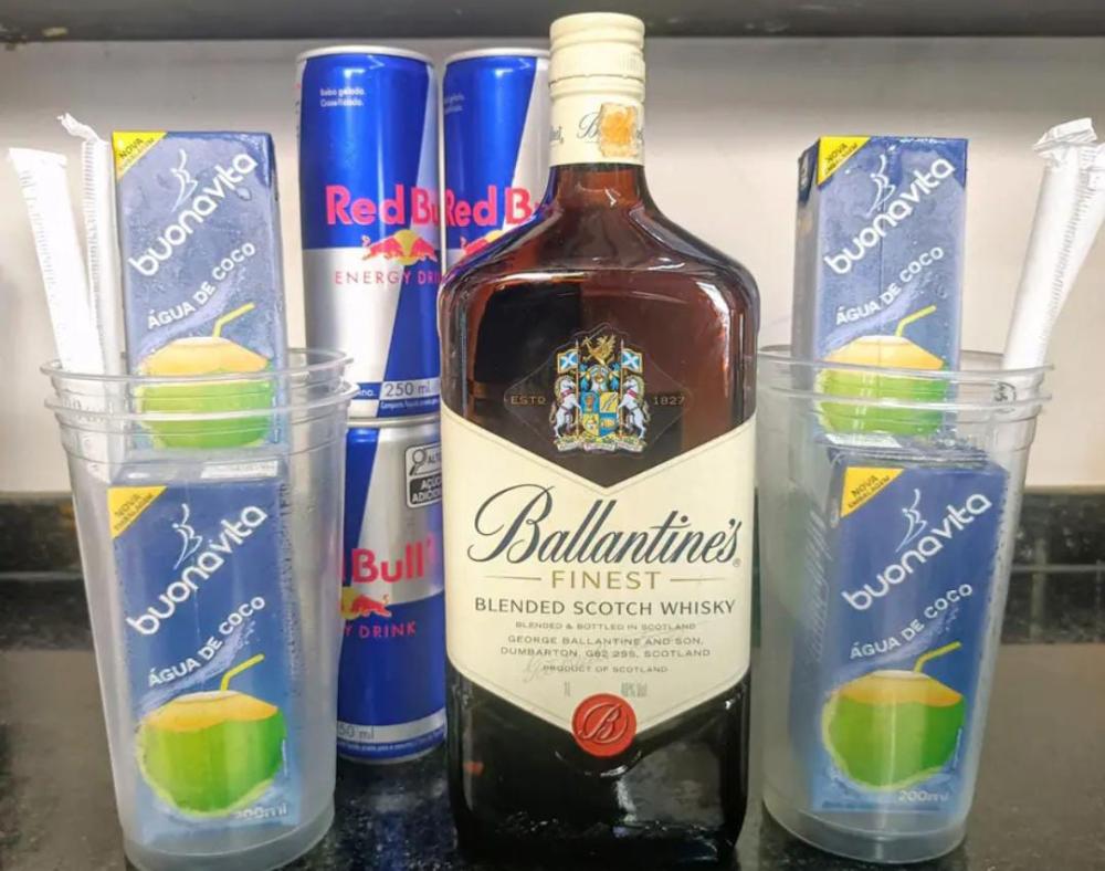 1 Whisky Ballantine's de 750ML Energéticos Red Bull de 250ml, 4 gelos Coco de caixinha, 4 copos e 4 canudos. PARA 4 PESSOAS.